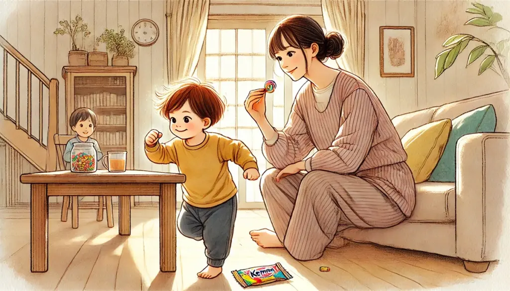 と差し出される、カラフルなグミやキャンディー。